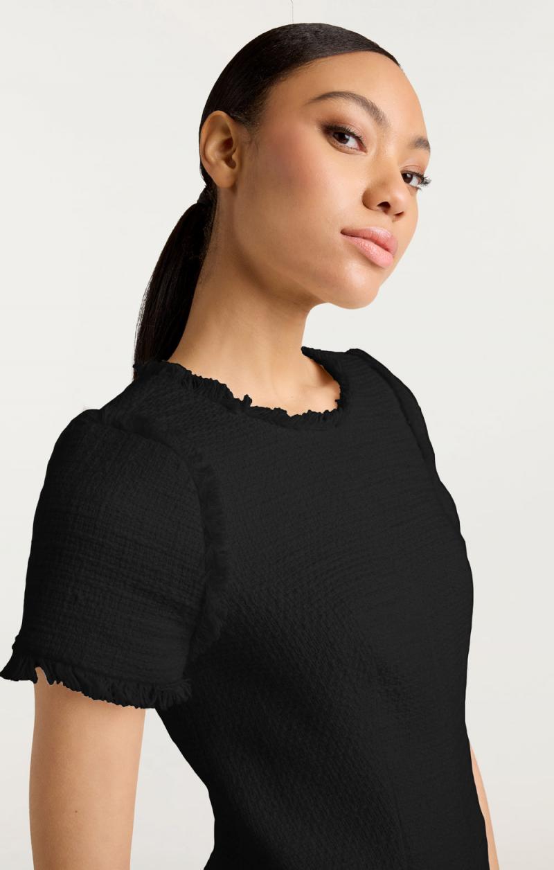 Introducing the Nova Dress – the perfect combination of boucle and pleats in a stunning gardenia color. With short sleeves and a fit and flare silhouette, this dress is both elegant and comfortable. Elevate your wardrobe with this must-have piece!Details Hidden zipper on backFabric: BoucleFit and flare silhouetteFringe hemline detailsShort sleeveContent and Care 100% CottonDry CleanImportedMeasurements 33.5in/90.17cm from shoulderMeasurements from size 4